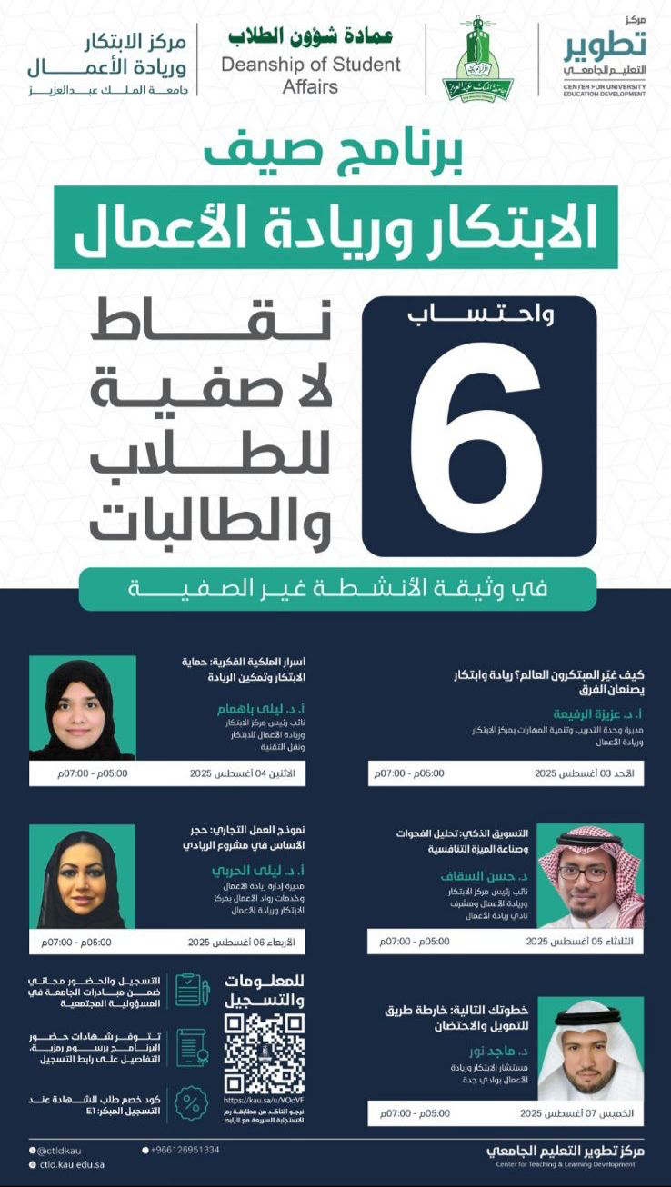 The Summer Innovation and Entrepreneurship Program is a specialized training initiative aimed at developing the skills of students and graduates in the fields of innovation and entrepreneurship, in line with the needs of the future job market. The program is offered by the Innovation and Entrepreneurship Center at King Abdulaziz University, in partnership with the Deanship of Student Affairs and the Center for University Education Development.